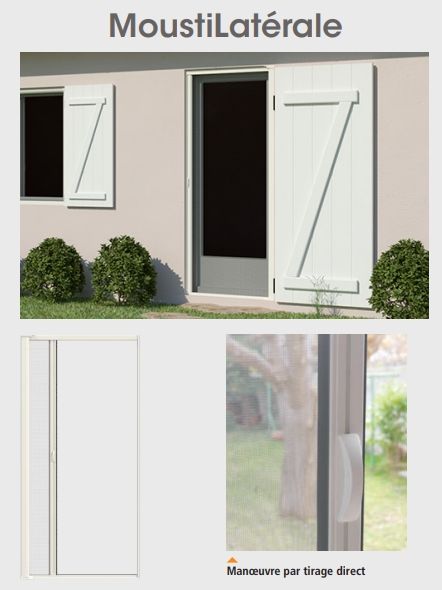 Elle se manœuvre par tirage direct de l’intérieur ou de l’extérieur grâce à sa poignée double réglable en hauteur et son ressort de rappel. La MoustiLatérale se bloque et se