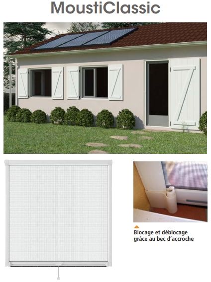 La MoustiClassic est une moustiquaire à enroulement vertical équipée d’un frein régulé assurant une remontée douce et silencieuse. Elle se manœuvre par tirage direct par cordon, et se verrouille par système de bascule avec embases réglables